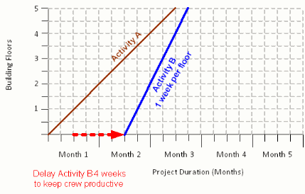 The diagram below shows that you should delay starting Activity B for four weeks. If you do that, then you will keep the crew productive for their entire stay on your project. If you were running a real project, you might include a bit extra time in case things backup, but you would likely not start Activity B as soon as it could start!